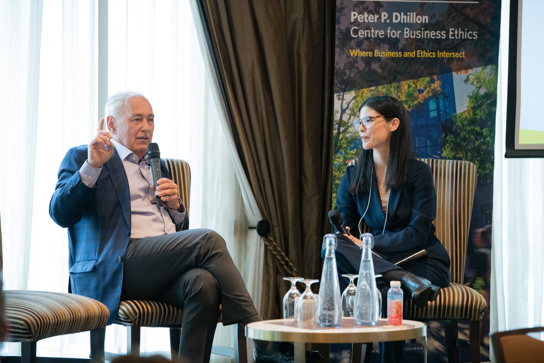 Guest speakers Dr. Ronnie Chatterji and Glen Clark debate the role of business with Dr. Kate White, Senior Associate Dean and Watkinson Professorship in Sustainability at UBC Sauder.