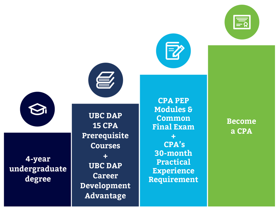 Officially recognized by the Chartered Professional Accountants (CPA) Canada, UBC DAP’s 15 courses qualify you for entry into CPA PEP. UBC DAP graduates consistently attain top results in the CPA PEP modules and Common Final Exam (CFE).